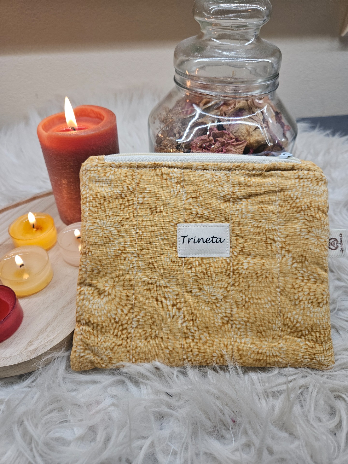 Kosmetická taštička rovná, velikost 18x15 cm. Podšita vatelínem, s podšívkou, prošita, na zip.