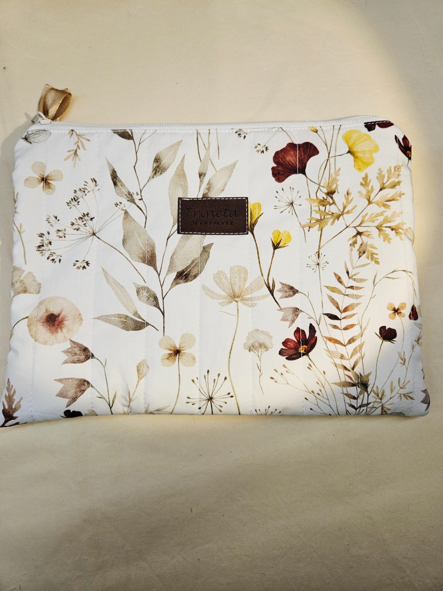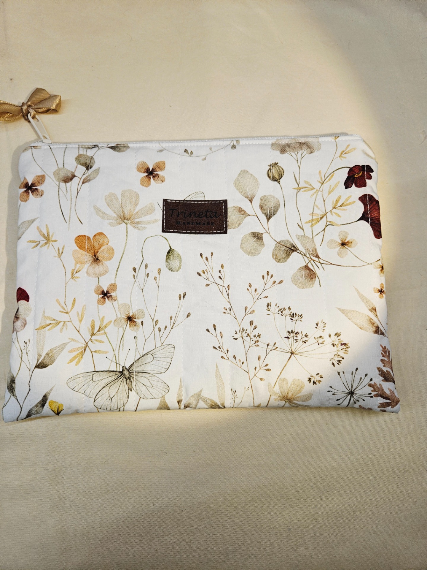 Kosmetická taštička s rovným dnem, ze zahraniční látky, prošita s vatelínem a podšívkou.