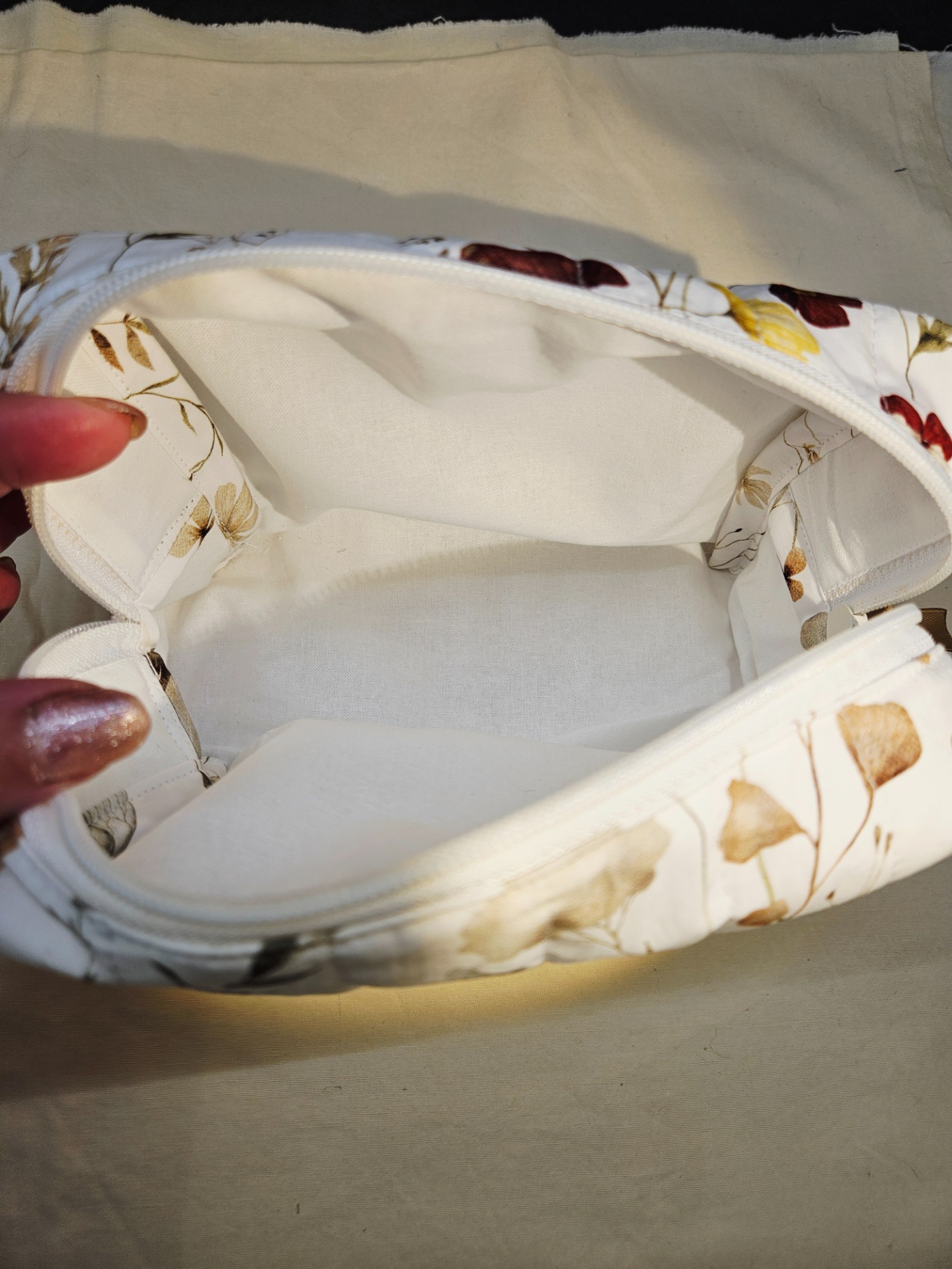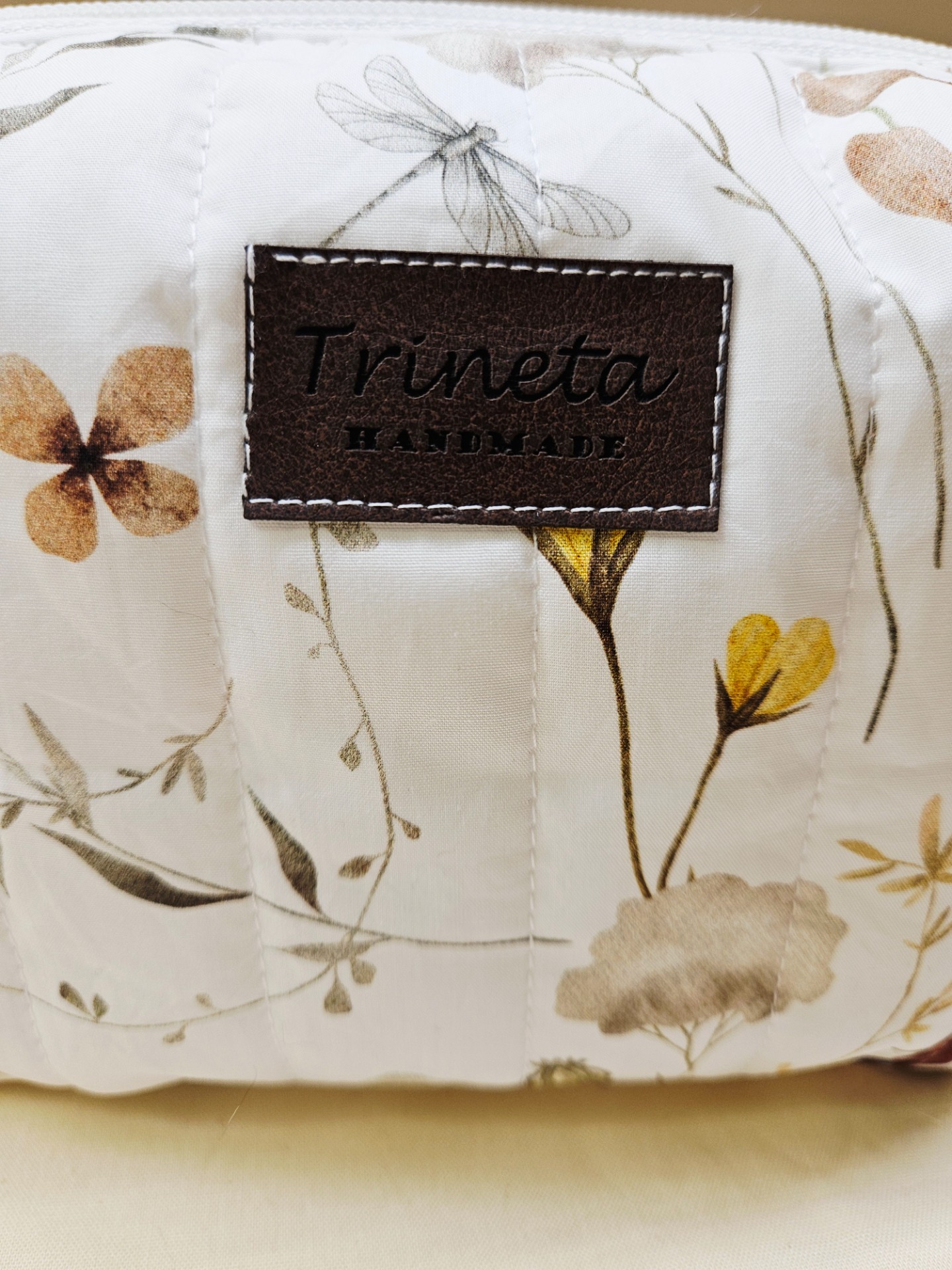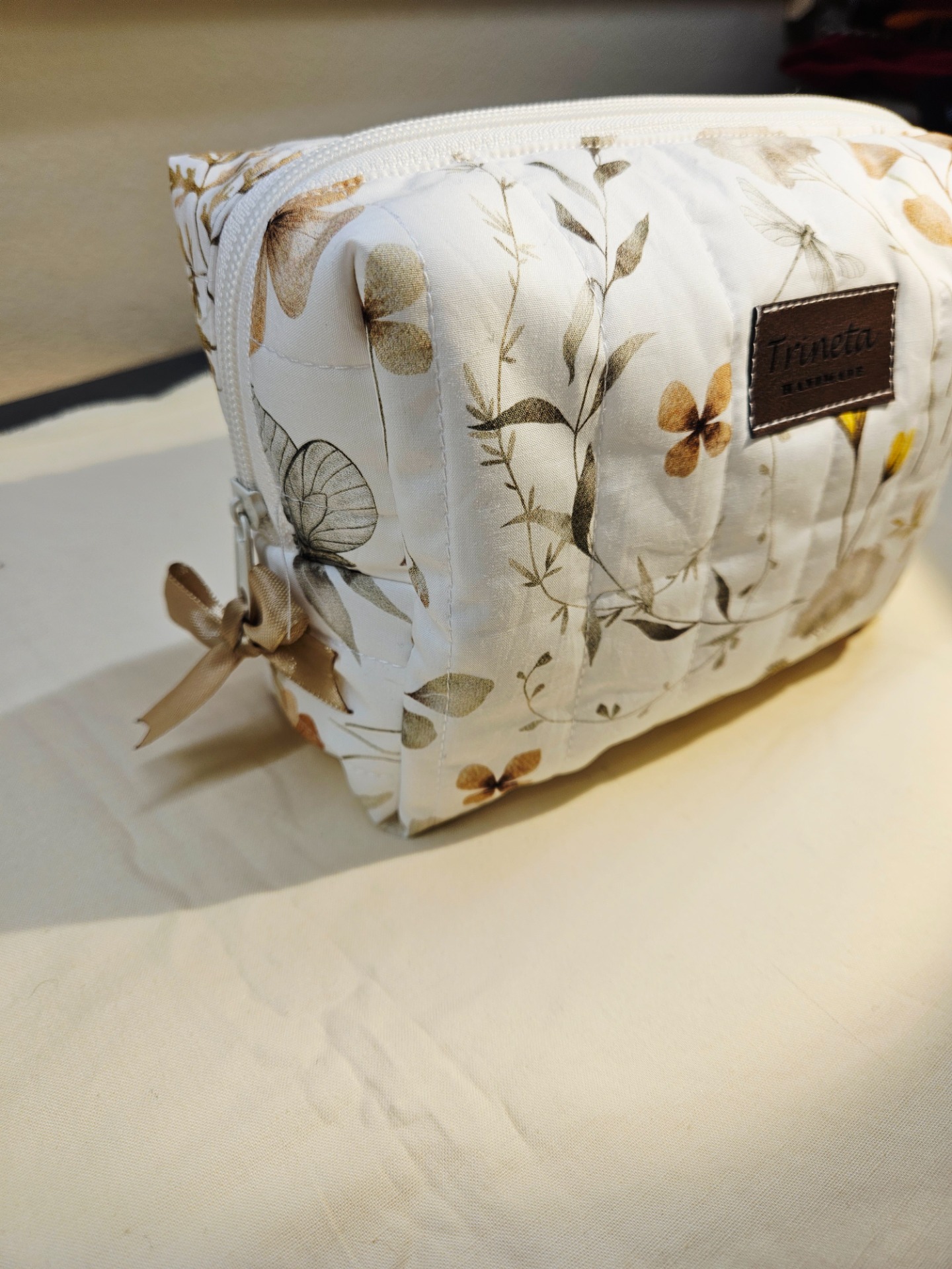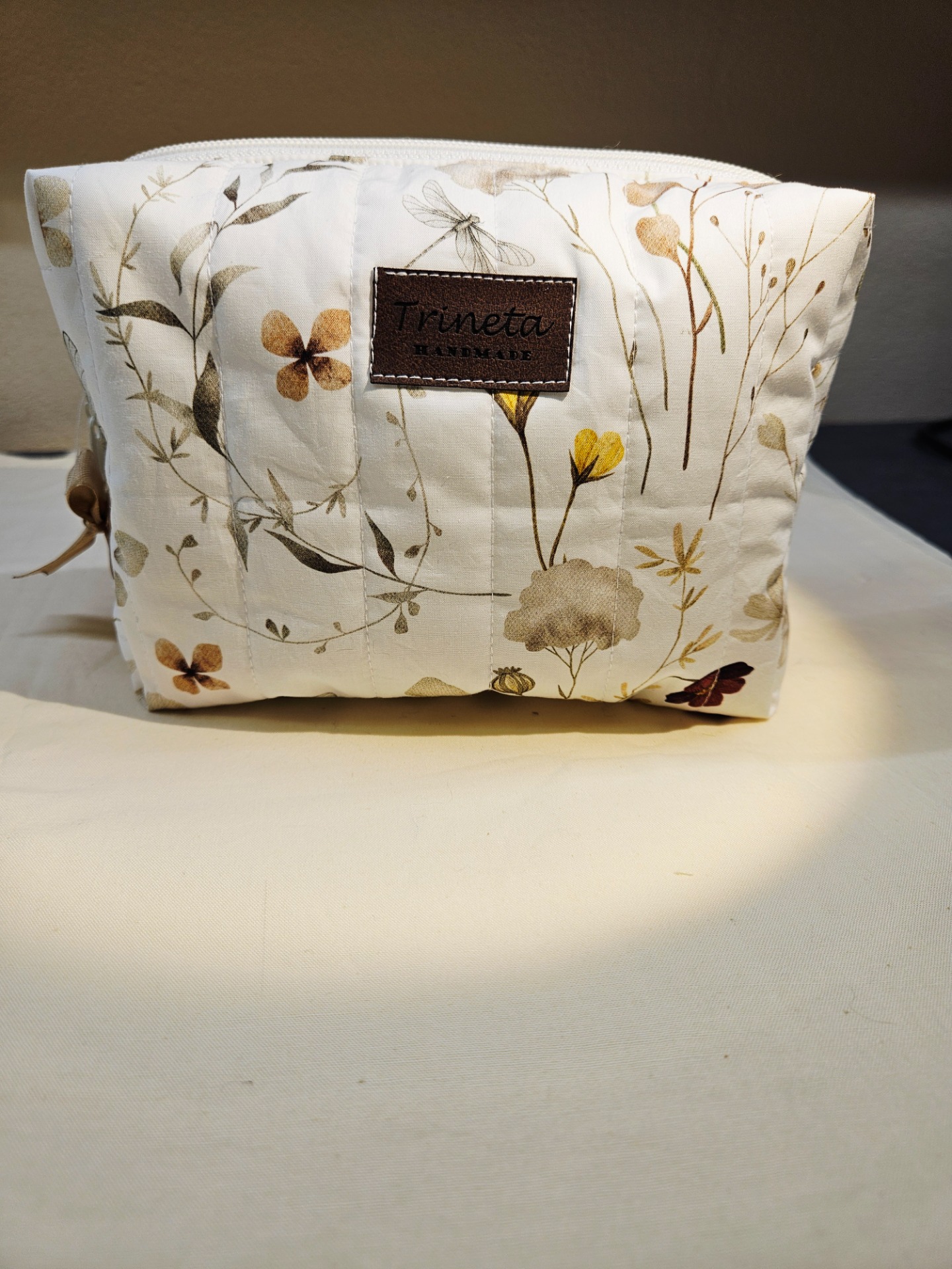 Krásná kosmetická taštička s velkým dnem ze zahraniční látky jemné na dotek.Otevírání na zip, ozdobený maličkou. Zdobně prošitá.Možno použít na kosmetické štětce, nebo hygienické potřeby.