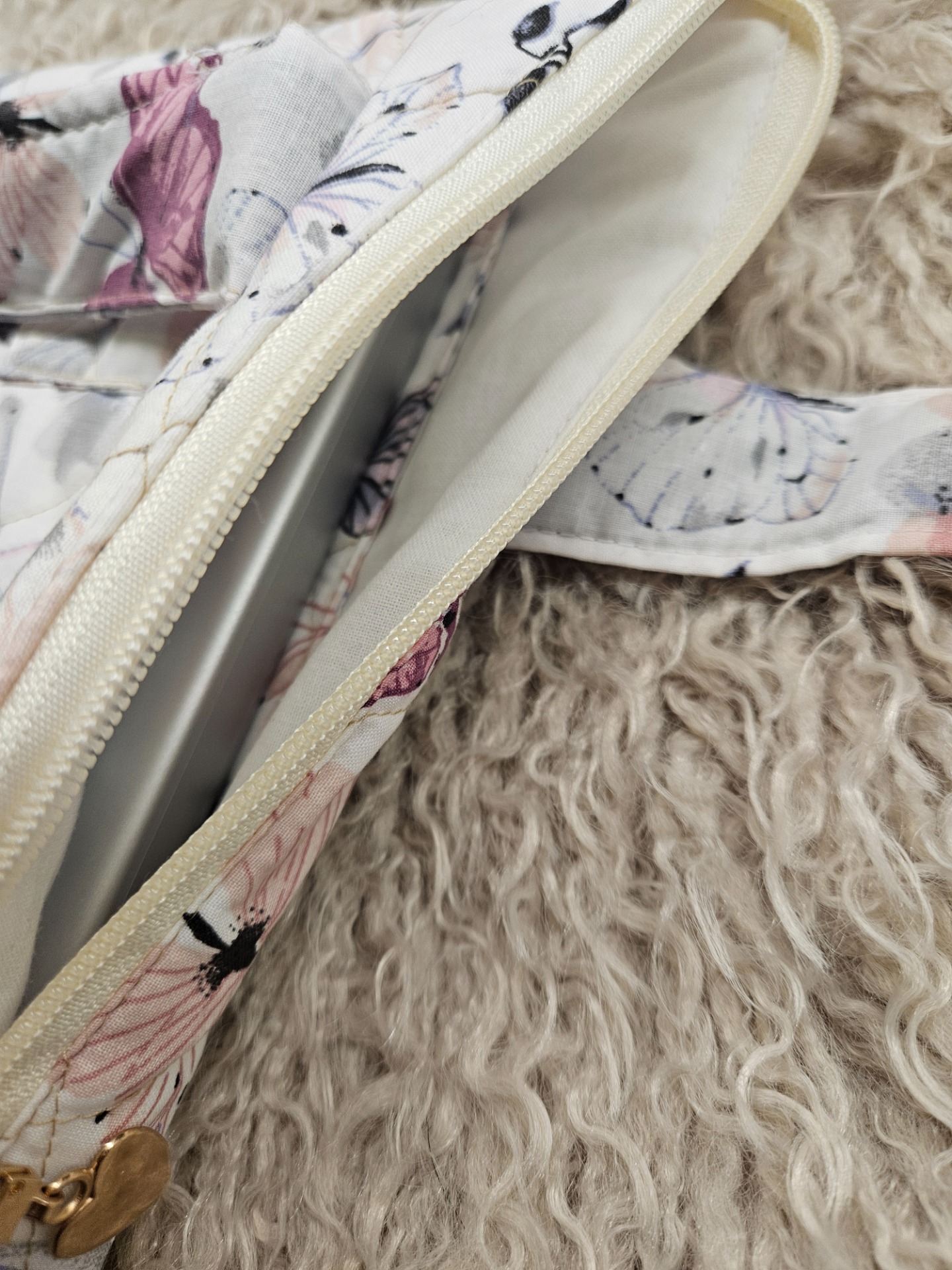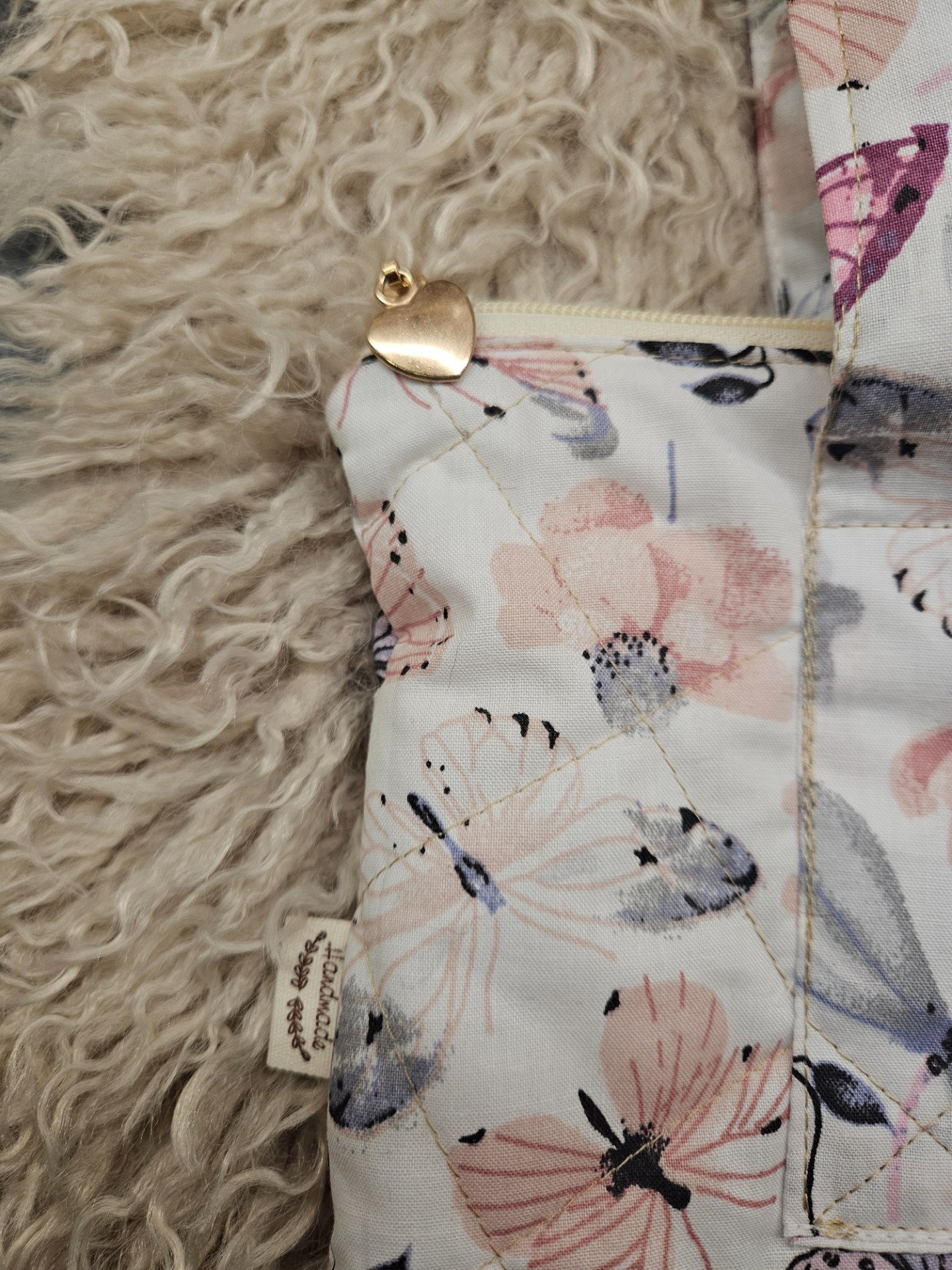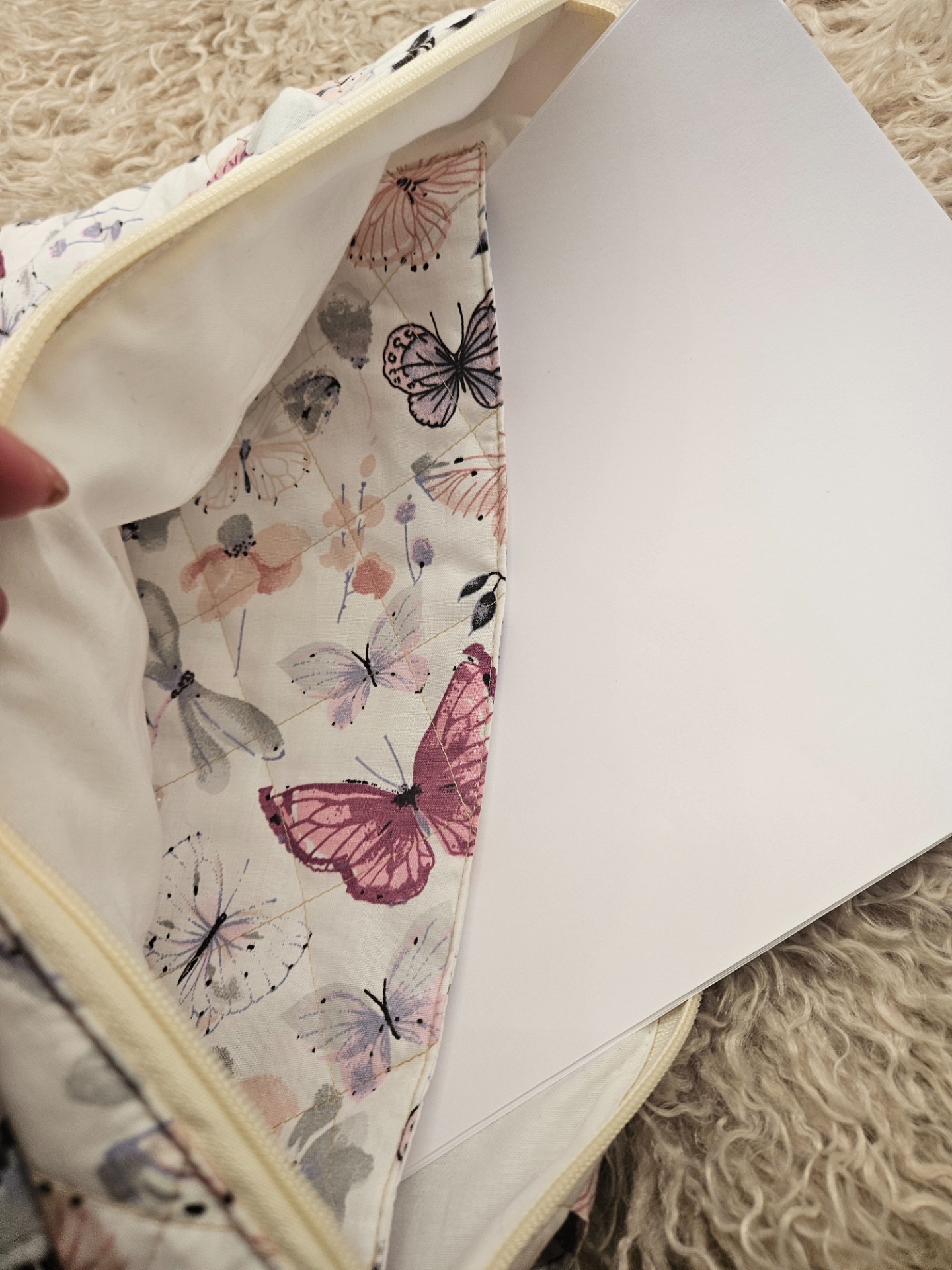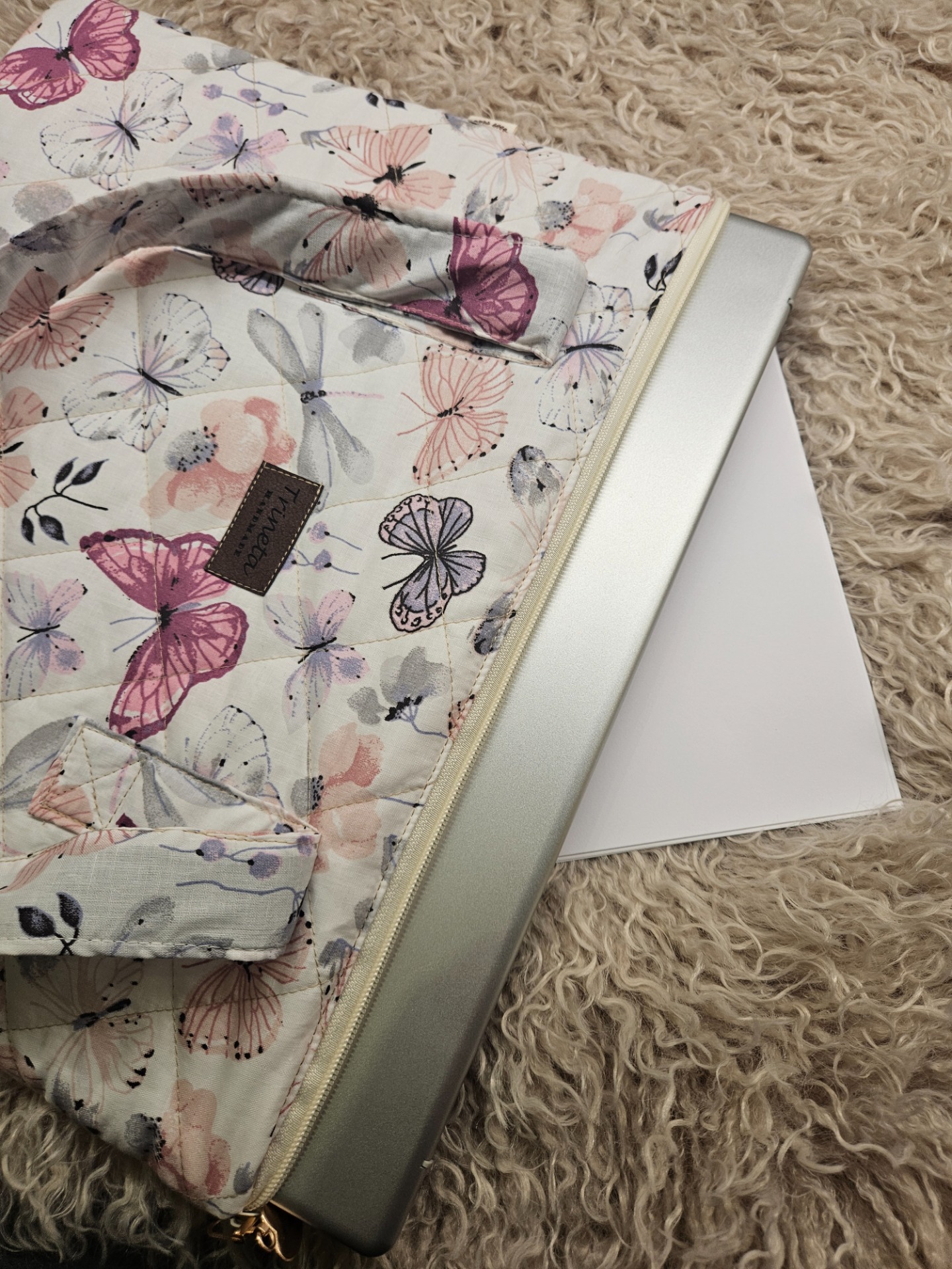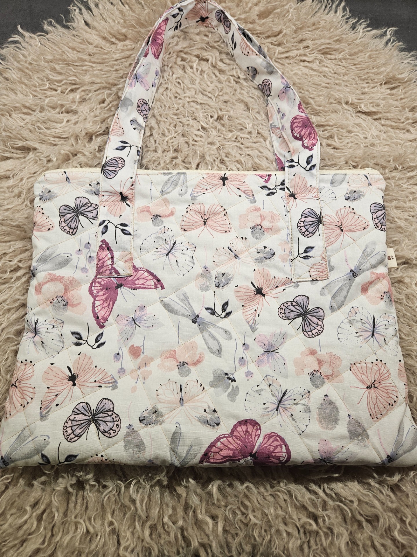 Krásná motýlková taška na notebook. Hustě prošitá, zapínání na zip, uvnitř kapsa na A4.Velikost 30x37 cm, délka popruhů 60 cm.