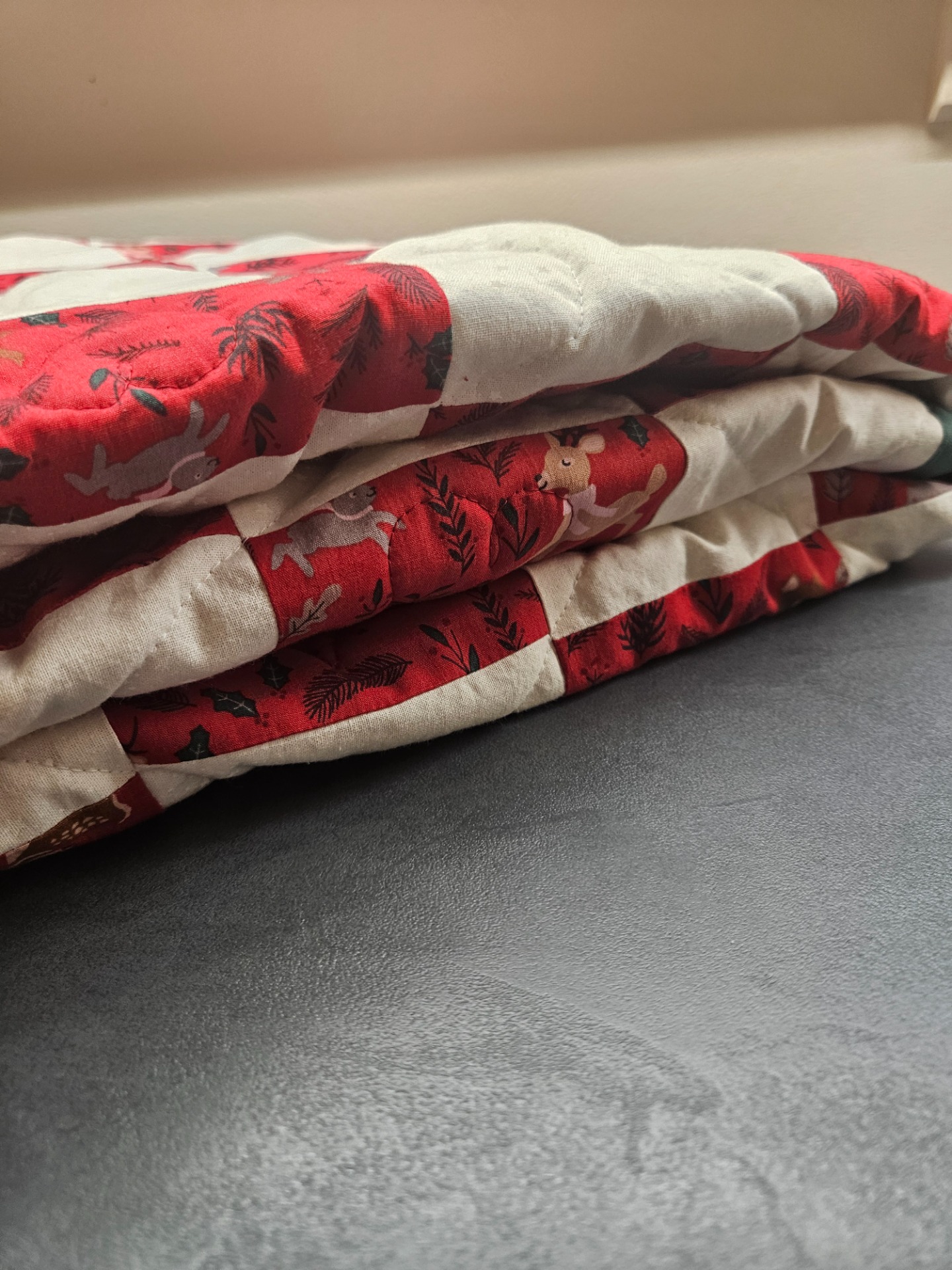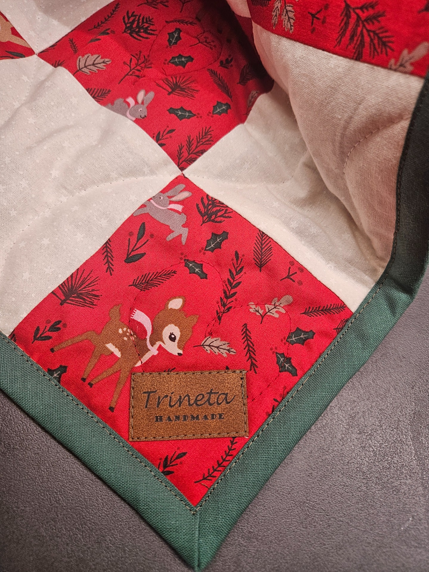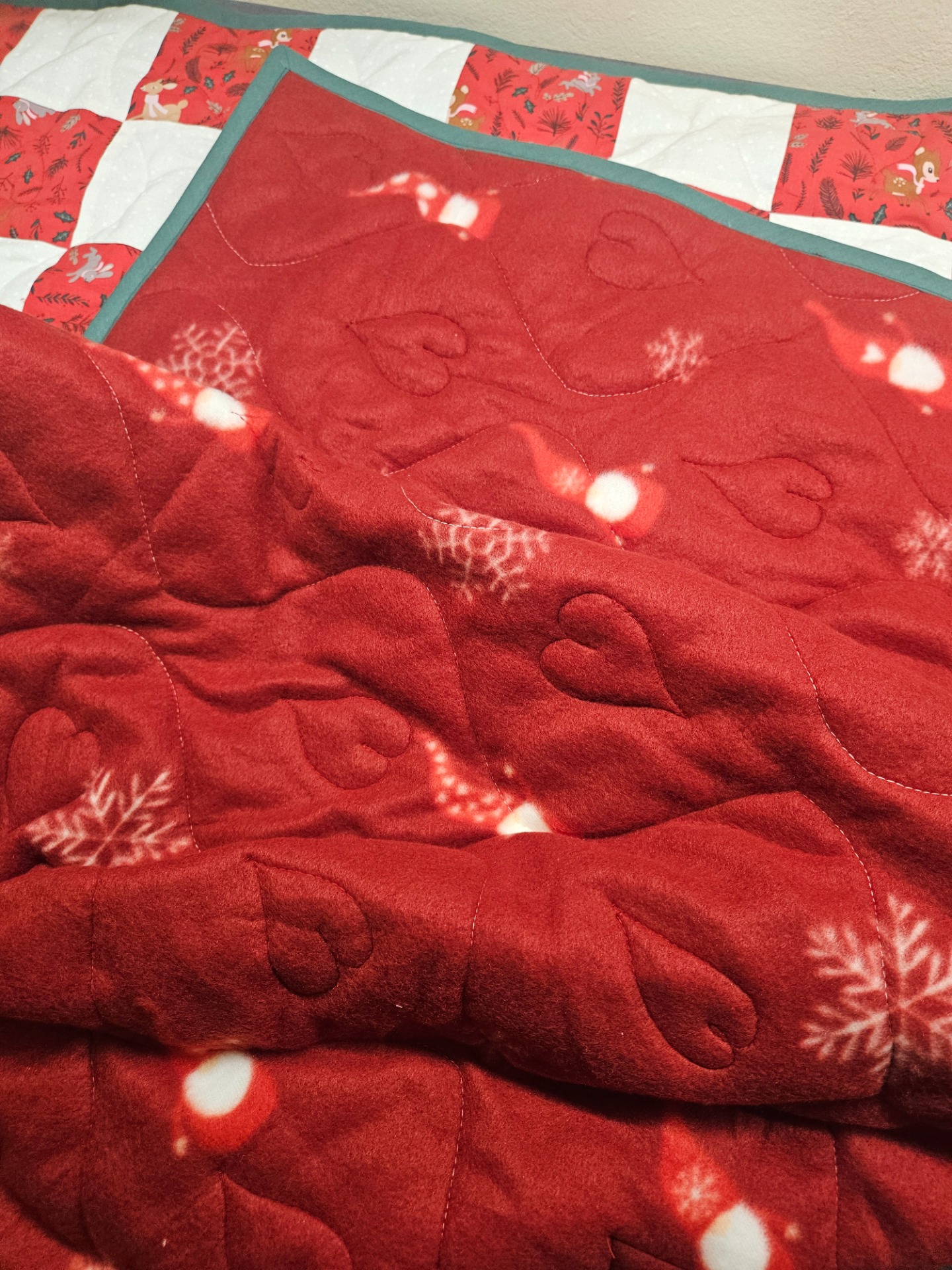 Vánoční koloušková deka s vatelínem a podšita fleesem.Hustě prošita ve tvaru vzoru a srdíček. Velikost 120x125 cm