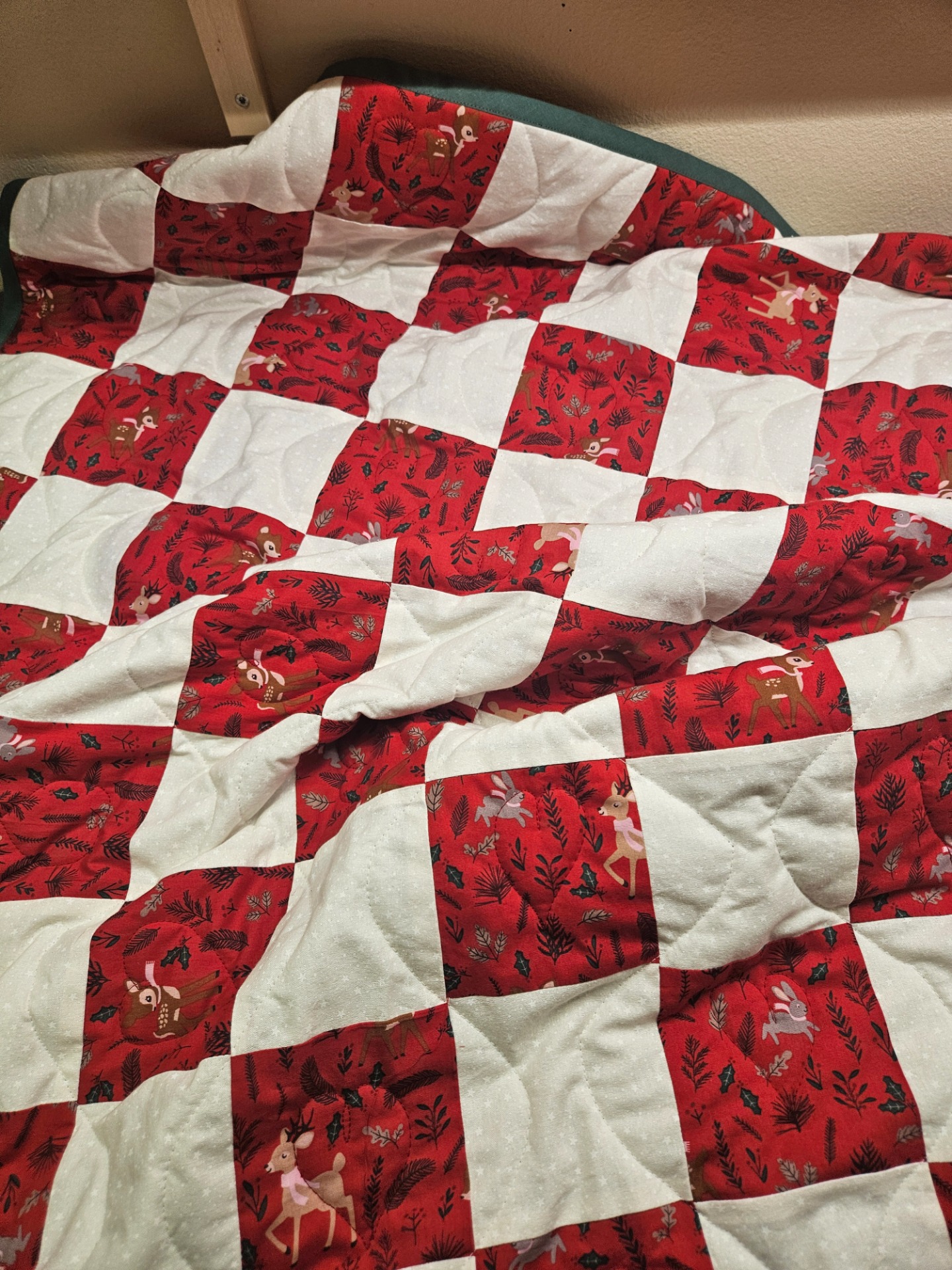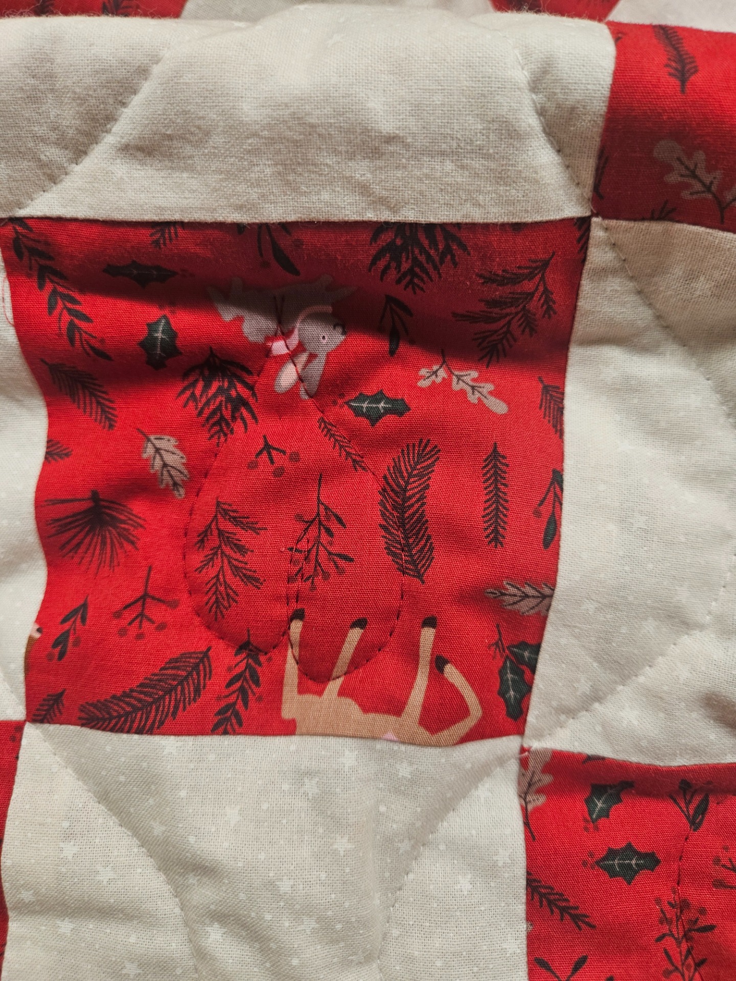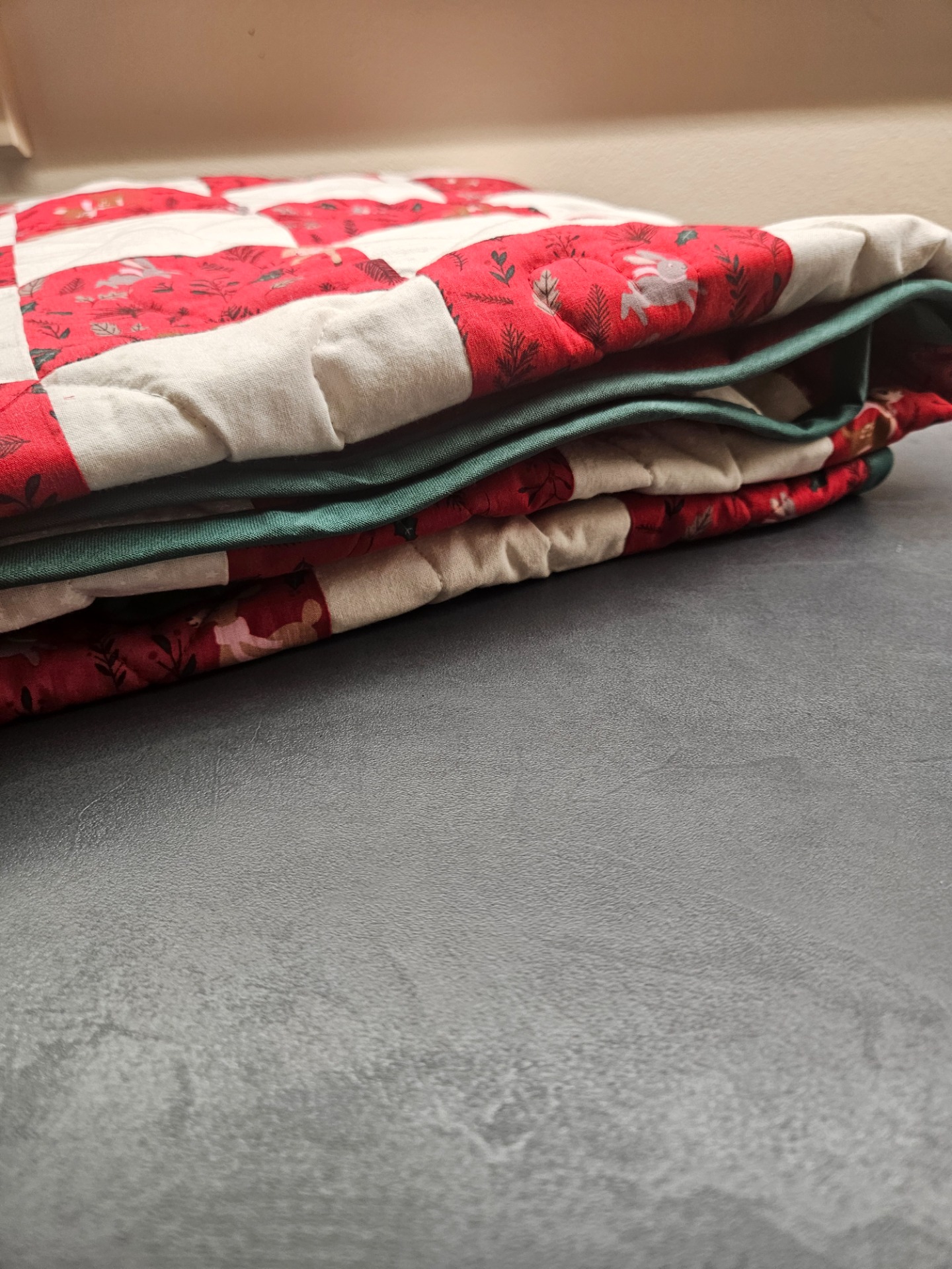 Vánoční koloušková deka s vatelínem a podšita fleesem.Hustě prošita ve tvaru vzoru a srdíček. Velikost 120x125 cm