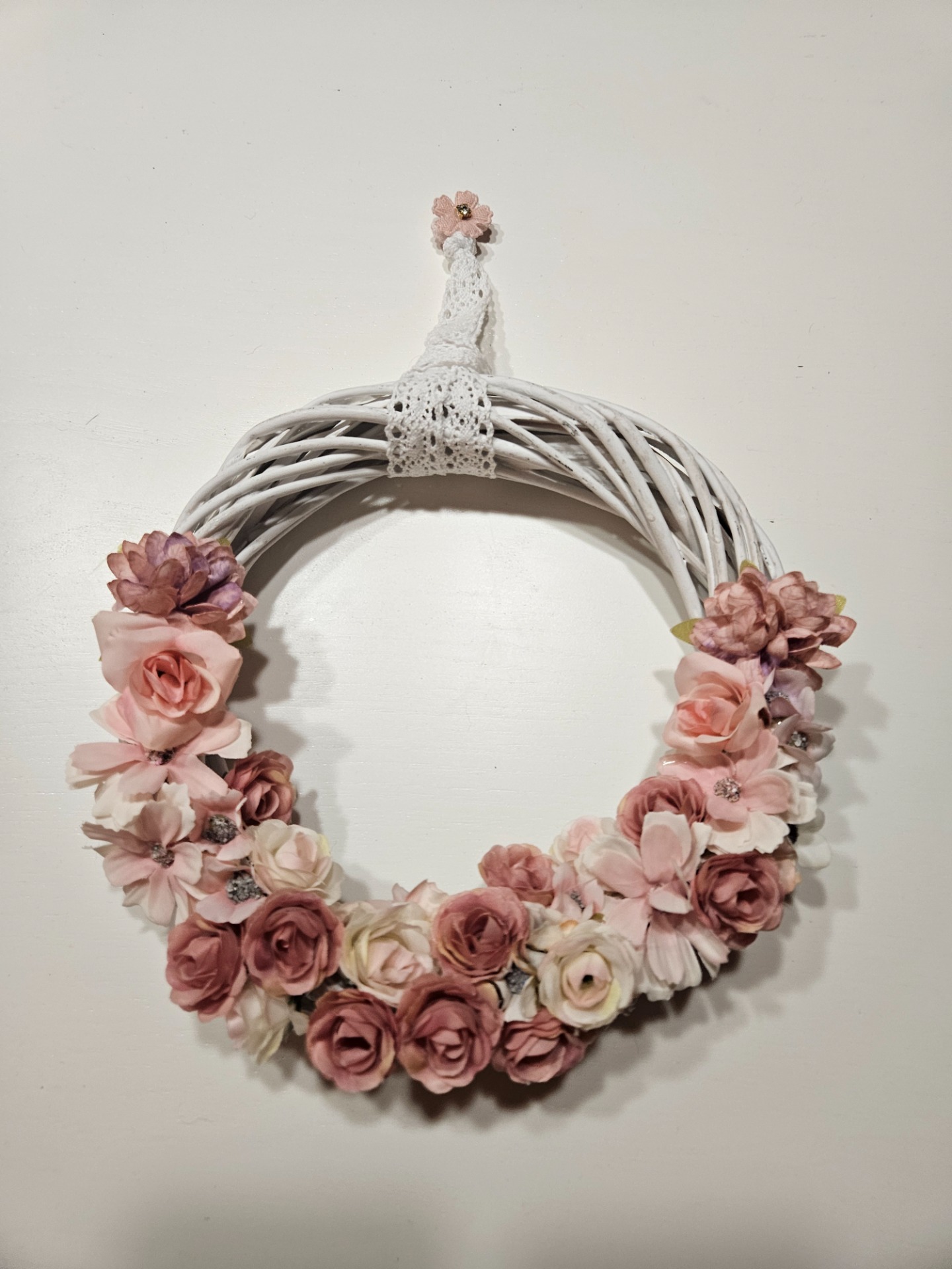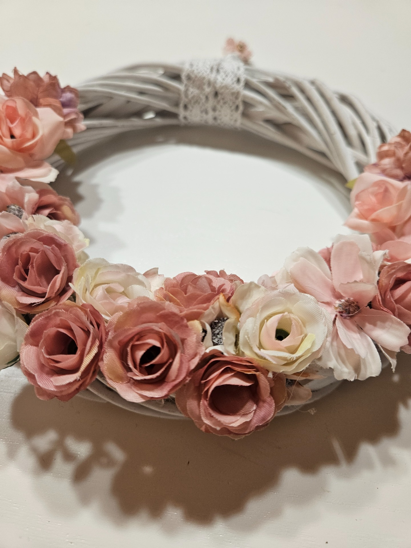 Krásný věnec s motivy růžiček a s poutkem na uchycení. Květinky jsou umělé, takže nezvadnou....Kouzelný na dveřích - kousek jara....Velikost cca 22 cm