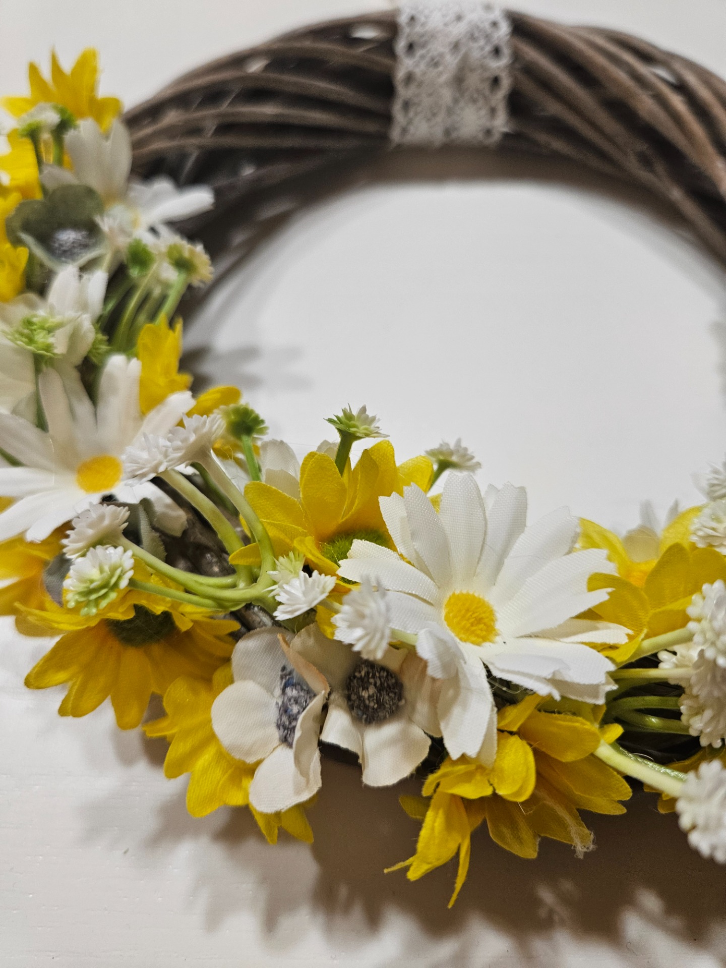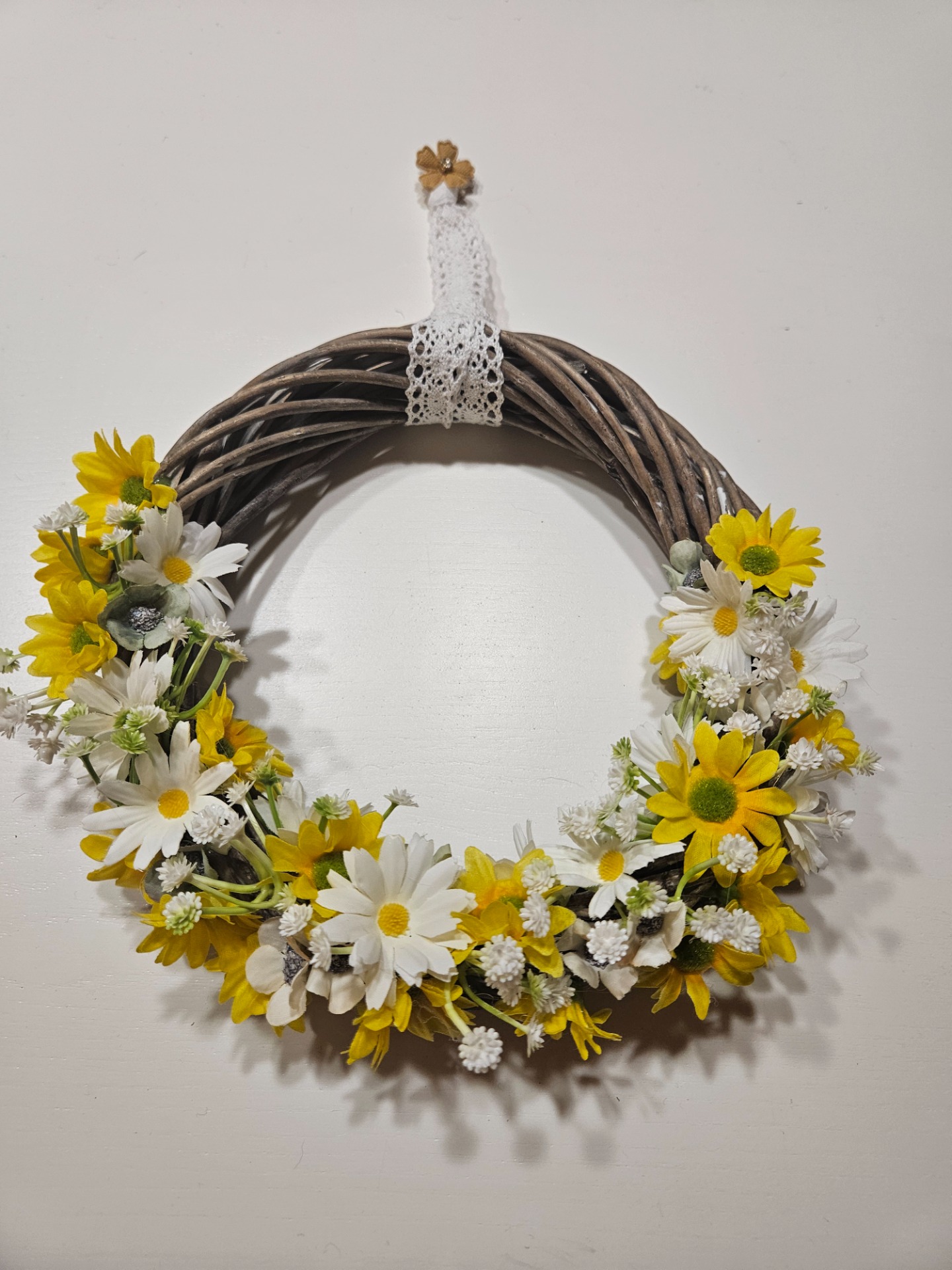 Krásný věnec s motivy sedmikrásek a s poutkem na uchycení.