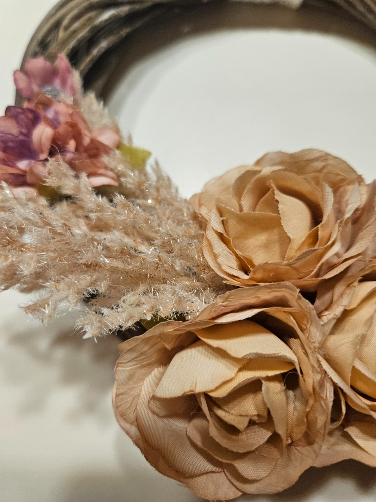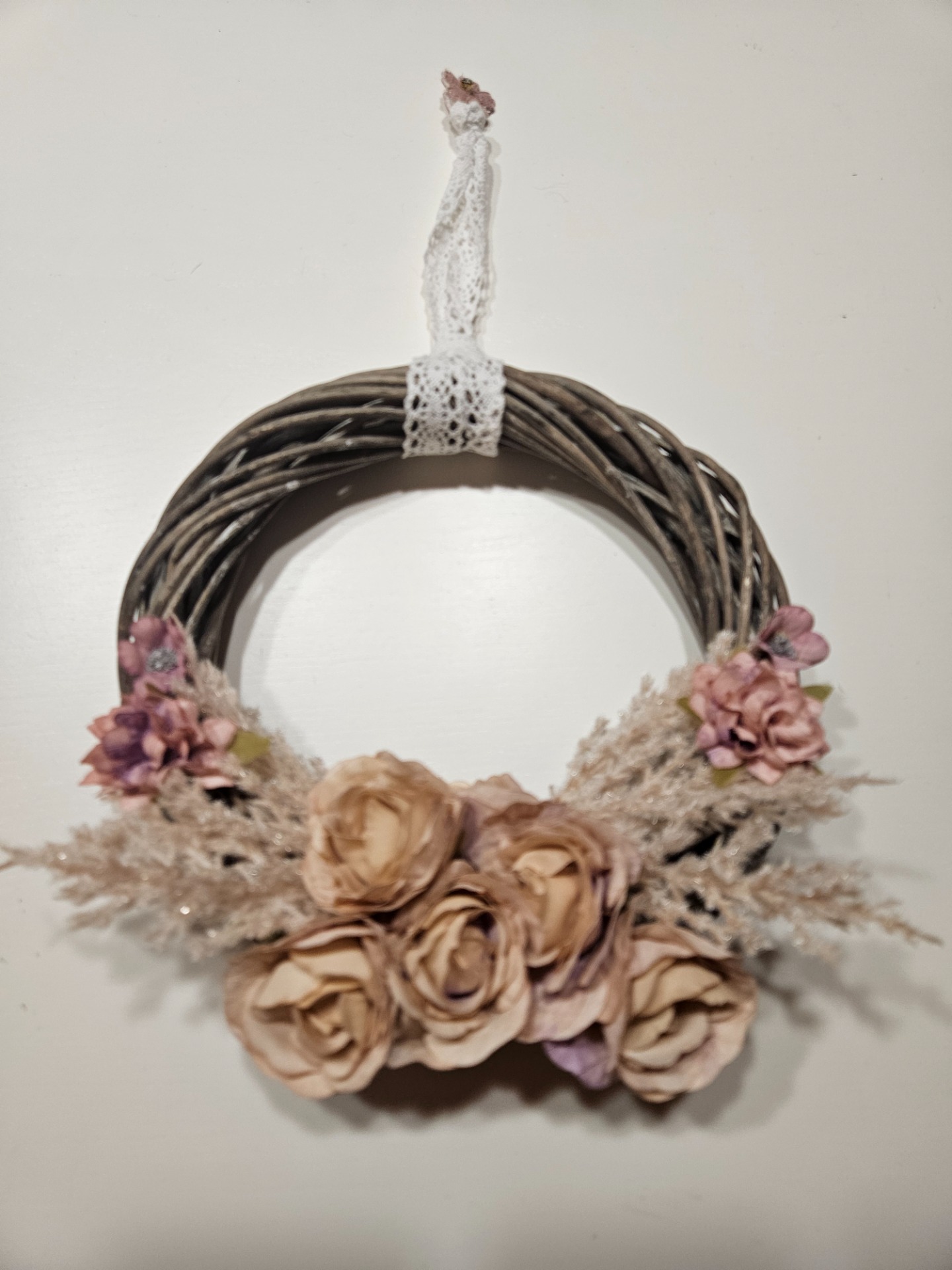 Krásný věnec s motivy růžiček a třpytivých trav a s poutkem na uchycení.